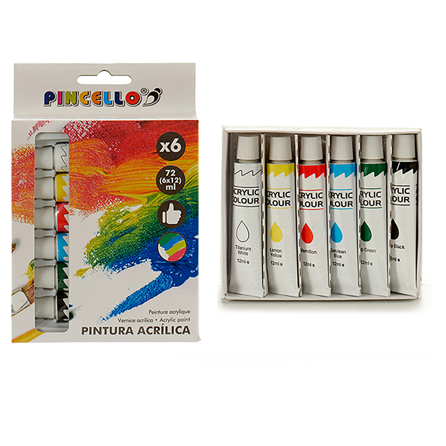 • Il comprend 6 couleurs différentes, jaune, bleu, blanc, noir, rouge et vert, chacune d'elles contenant 12ml.