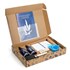 - Le coffret contient tout le matériel nécessaire, avec les feuilles de papier, le cadre d'impression en verre, le pinceau et l'émulsion de cyanotype.