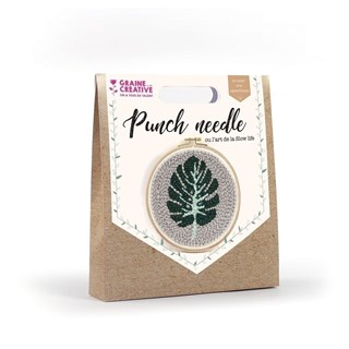 le tambour, la toile, une aiguille à puncher en bois, la laine et une notice d'utilisation illustrée, pour vous permettre de réaliser un objet de décoration personnel et tendance, motif feuille monstera