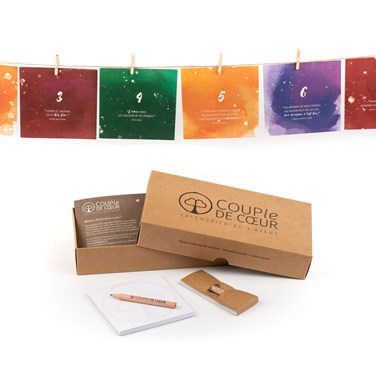 COUPle DE COEUR est une entreprise engagée pour le développement durable. Nous utilisons des matières premières respectueuses de l'environnement, les couleurs utilisées sont végétales. Nos produits sont sans plastique et neutre sur le plan climatique. Pour chaque boîte vendue, un arbre est planté.