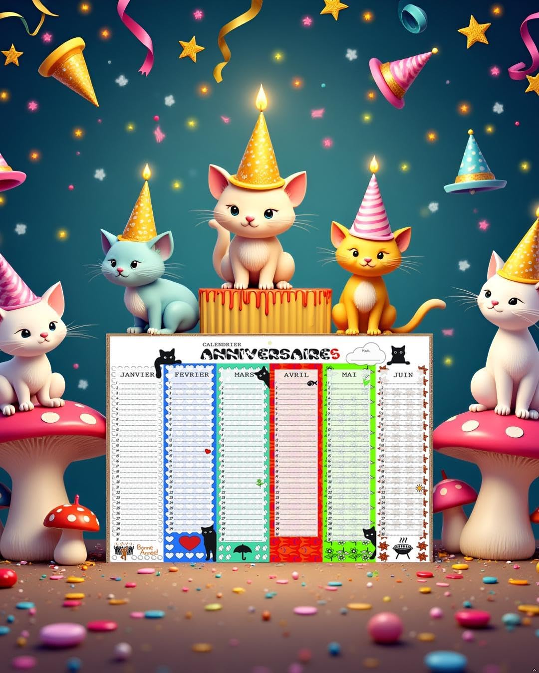 Calendrier perpétuel anniversaires motif chat – format a3 – inscriptible