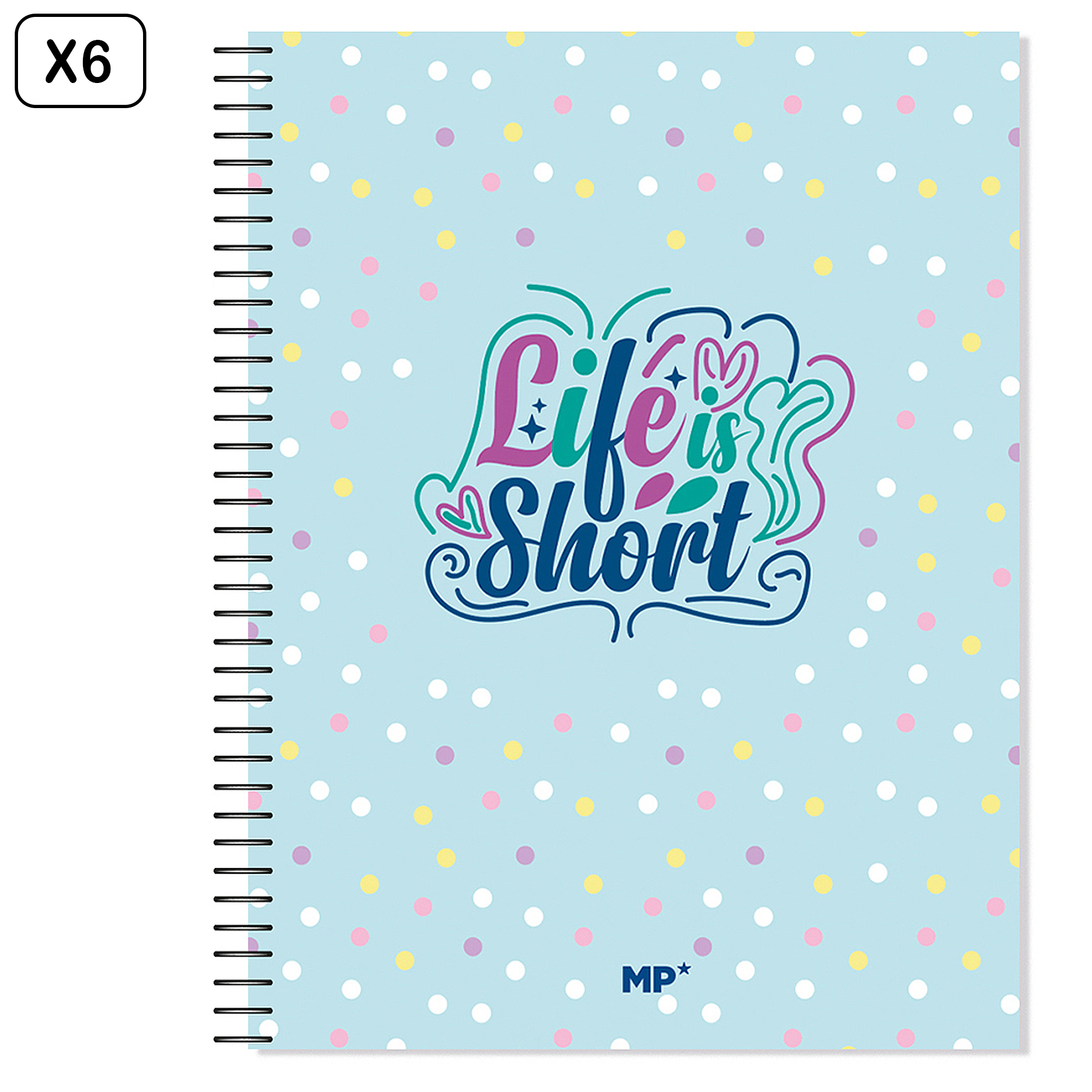 • Ligné : quadrillage de 5 mm. Taille A4+. Dimensions : 231 x 295 mm. Couverture avec le design Life is short.