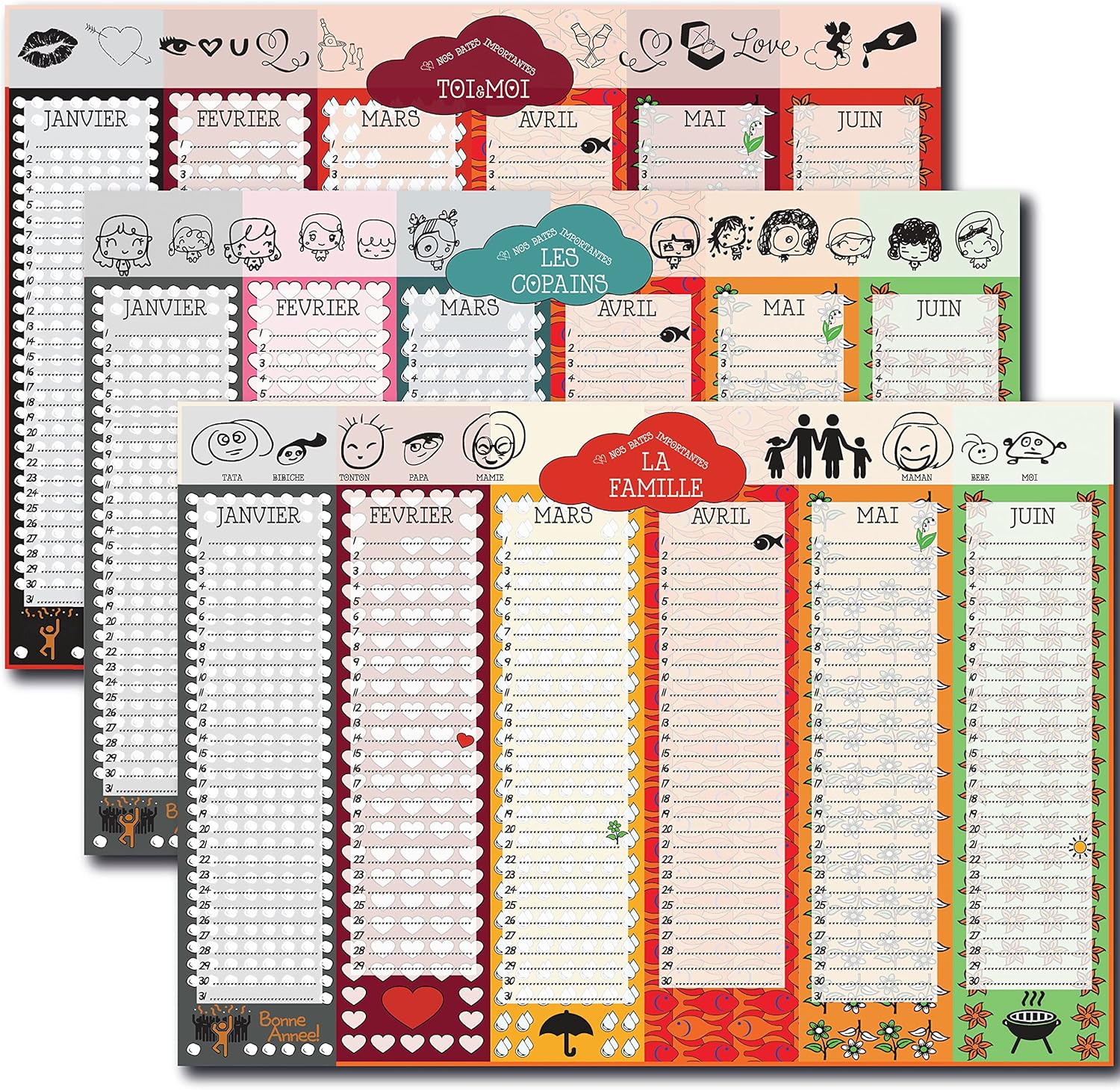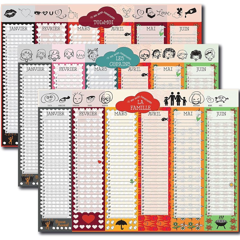 Pack de 3 calendriers perpétuels anniversaires - famille couple et copains - a3