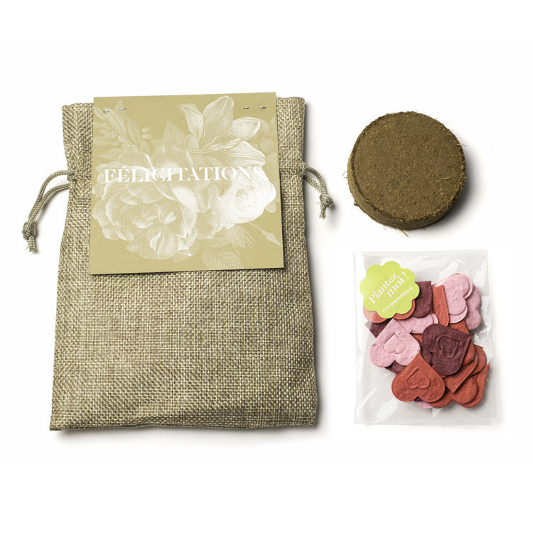 Ce jardin est composé d’une terre compressée en coco, d’une vingtaine de florettis ensemencés de fleurs sauvages et d'un sac en toile de jute.