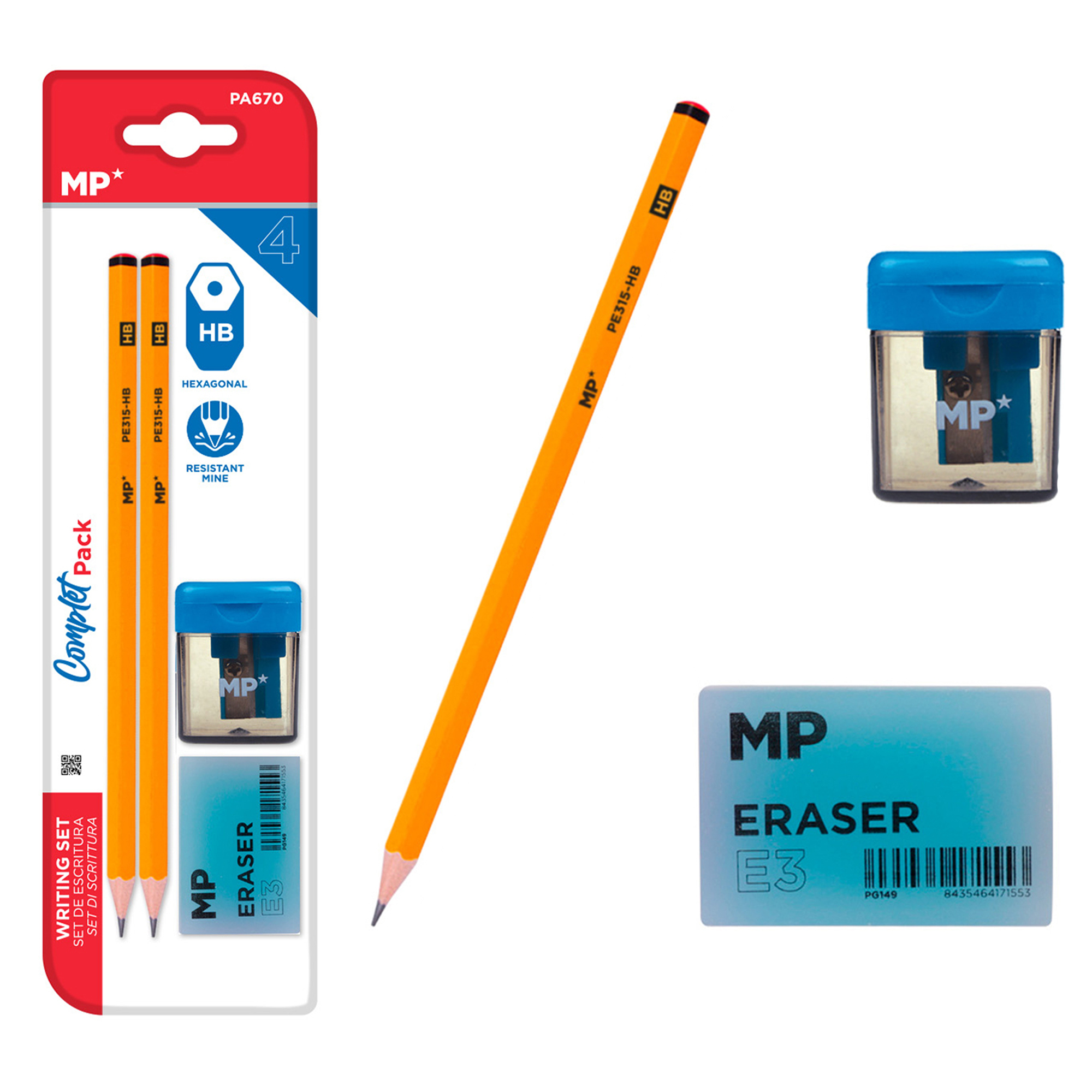 Ensemble d'écriture : 2 crayons hb, 1 taille-crayon avec réservoir.