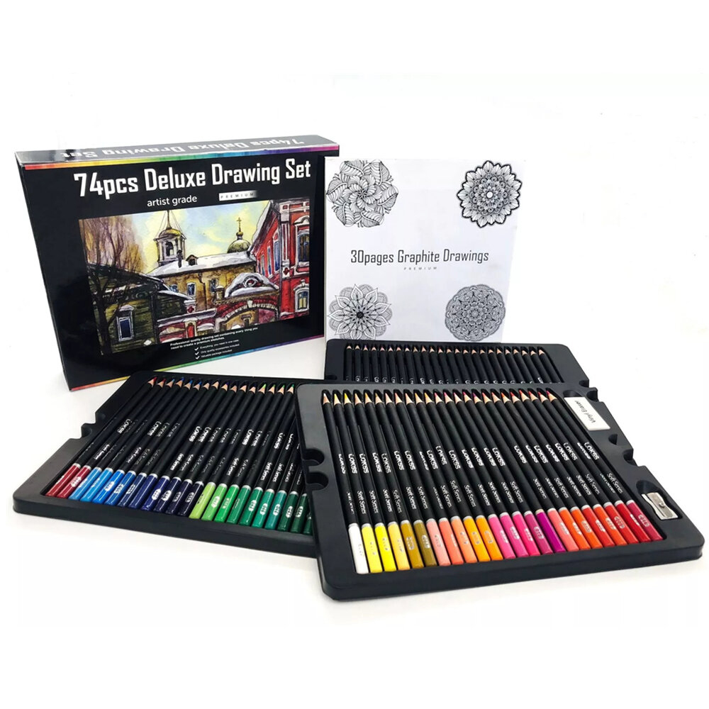 Ensemble de 74 crayons de couleur deluxe drawing avec gabarit de dessin et gomme