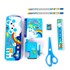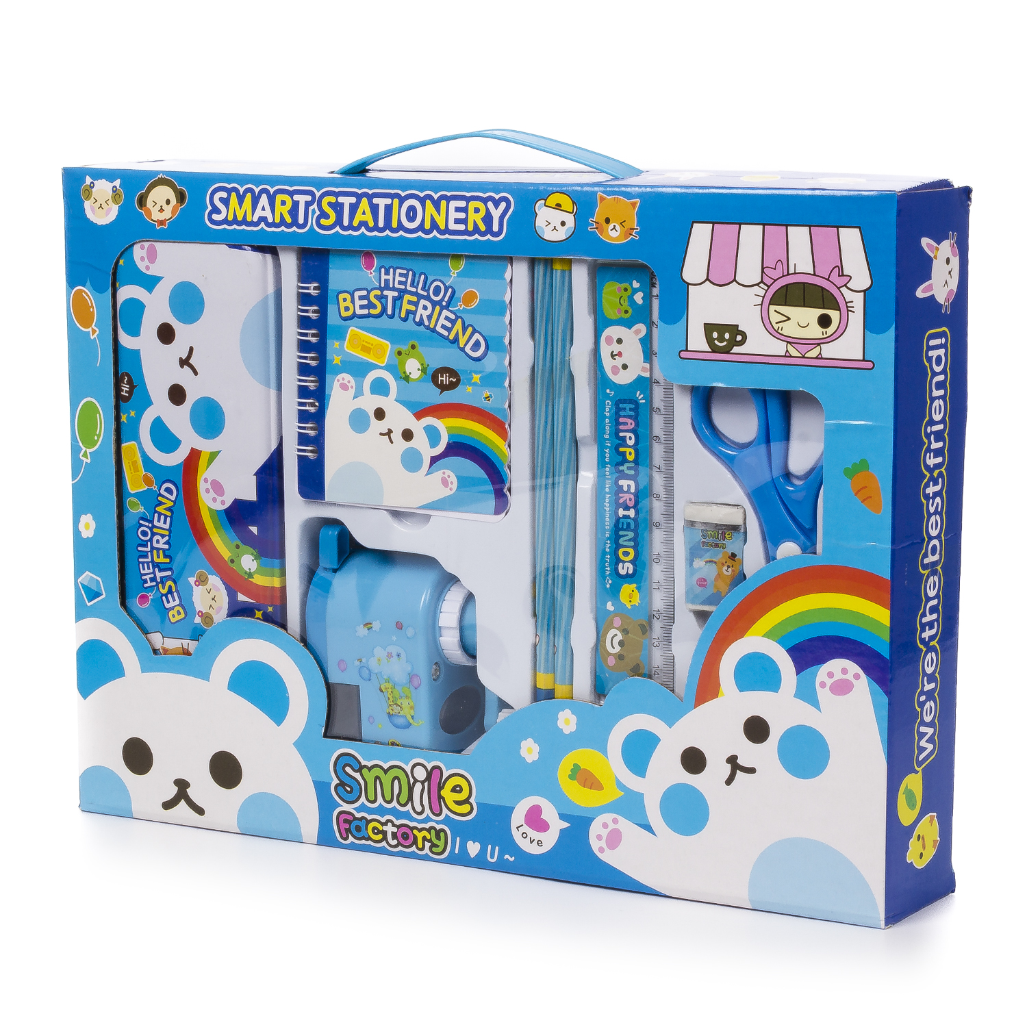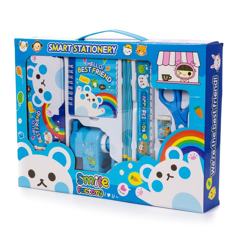 Ensemble de papeterie, comprenant : • Mallette métallique individuelle, 2 niveaux. 21x7x2,7cm. • Taille-crayon à manivelle • Gomme • Règle de 15 cm. • x2 crayons HB. • Carnet de notes avec spirale • Ciseaux en plastique pour enfants