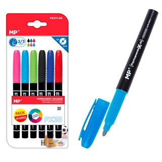 • Couleurs intenses et de longue durée. Blister de 6 unités : bleu foncé, rose, noir, vert, rouge et bleu.