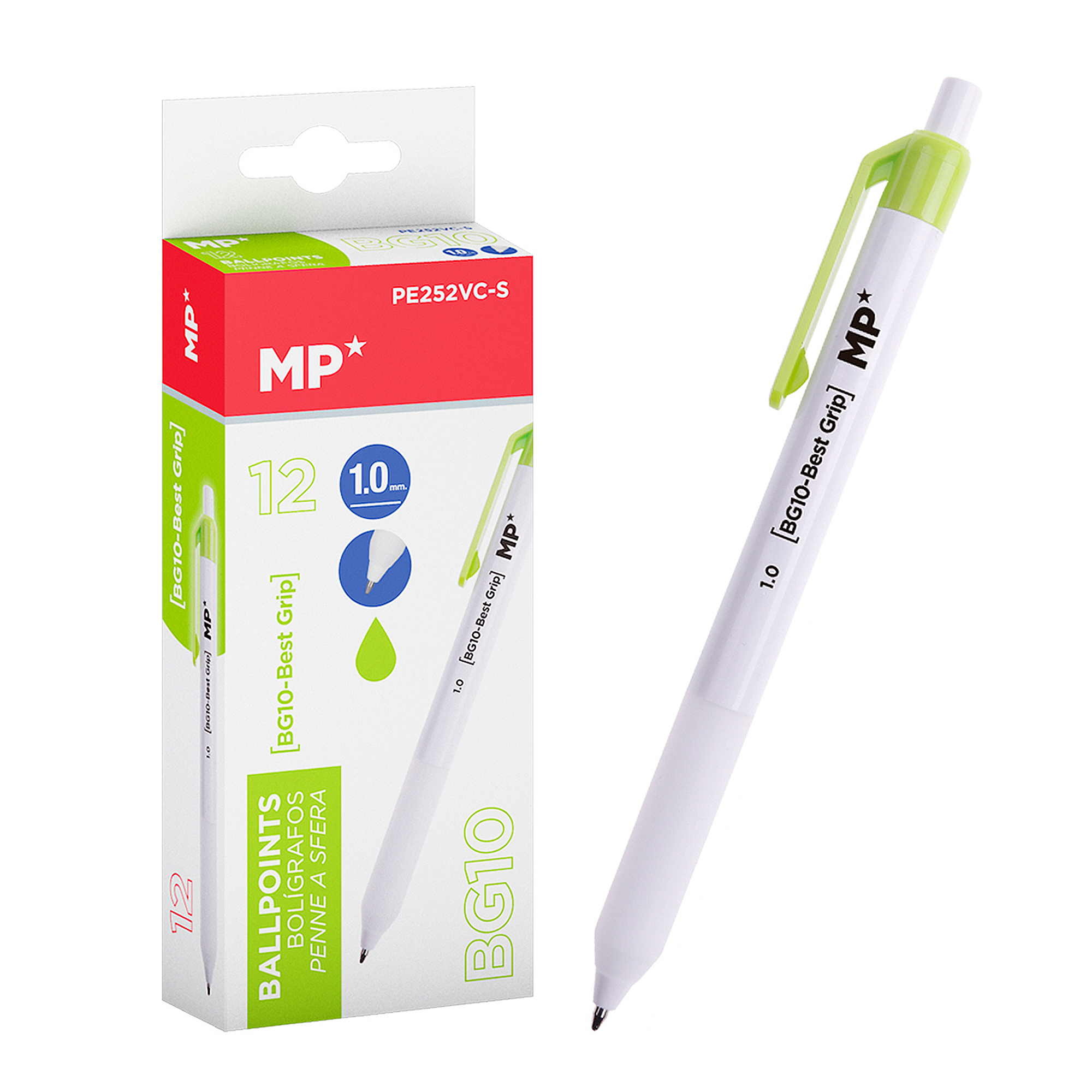 • Corps en plastique opaque blanc avec une prise de maintien et de l'encre à base d'huile en vert clair. De plus, il dispose d'un clip de maintien de la couleur de l'encre.