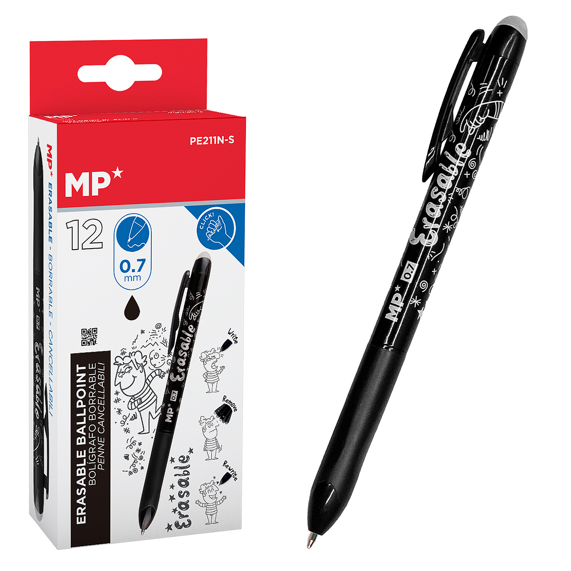 • Encre effaçable par friction avec la gomme située en haut. En frottant, l'encre s'estompe sans laisser de traces ni de taches sur le papier, permettant de réécrire rapidement.