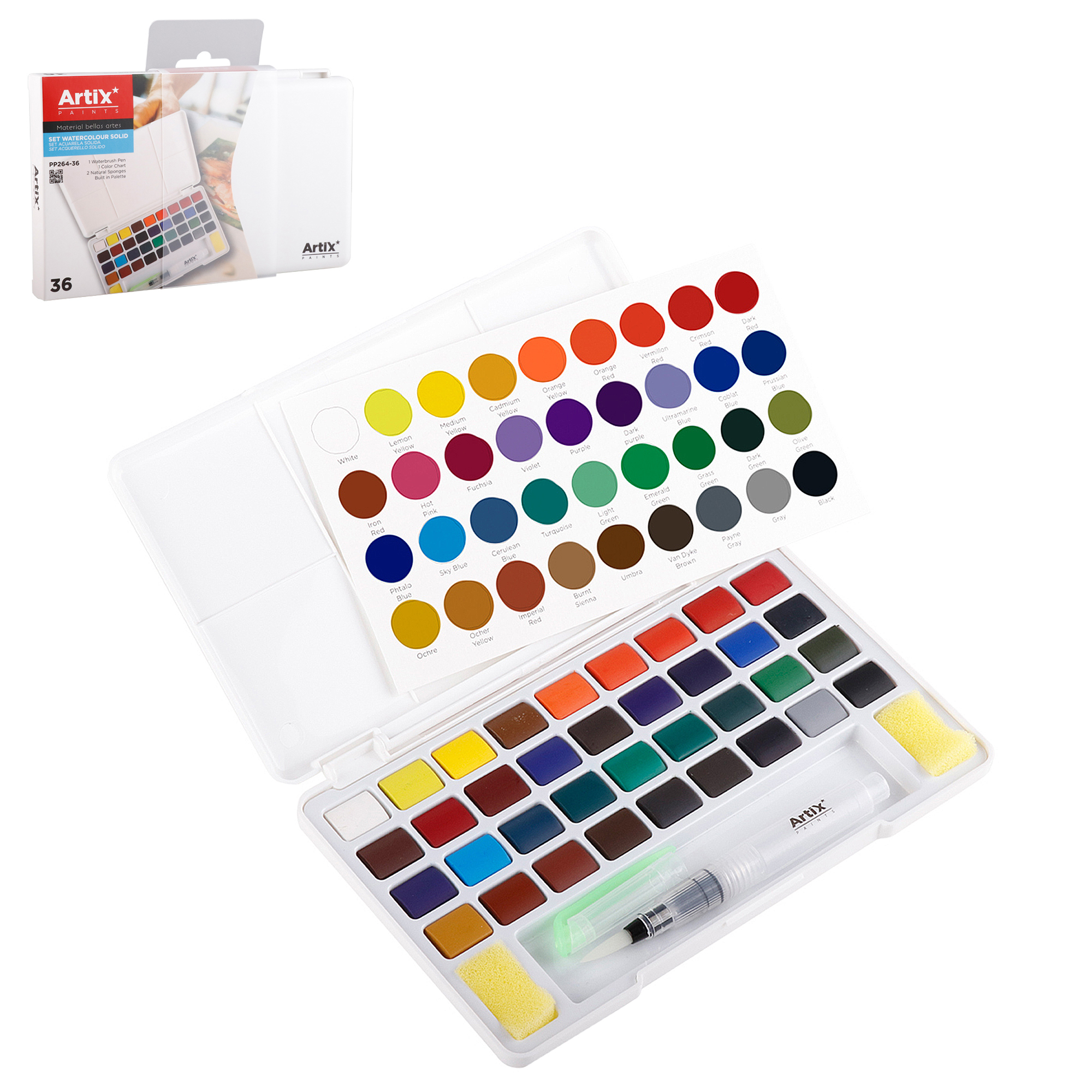 • Étui en plastique avec couvercle protecteur et godets pour pouvoir mélanger les couleurs. Inclut un pinceau.