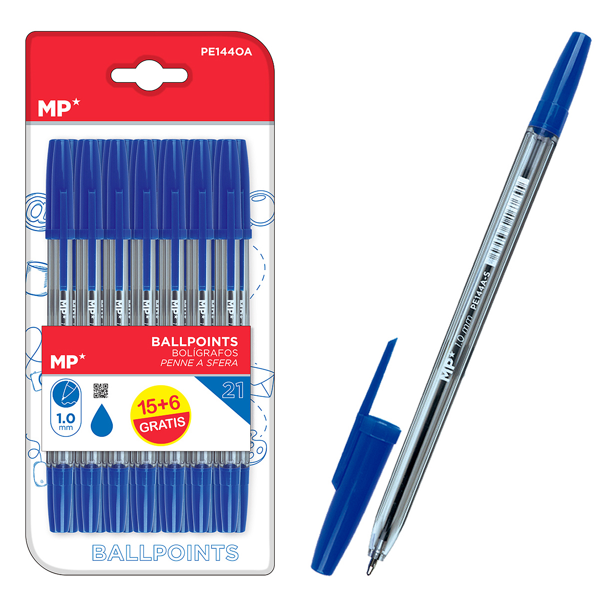 • Taille : 145 mm. Présentation en blister de 21 stylos bleus (15 + 6 gratuits).