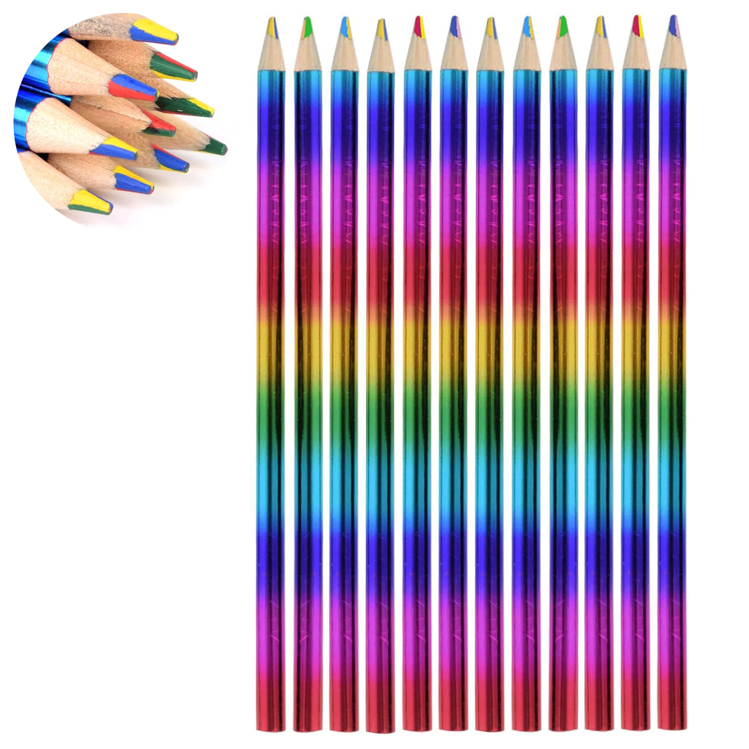 Ensemble de 12 crayons magiques en bois arc-en-ciel • Les crayons arc-en-ciel offrent une variété de couleurs vives pour ajouter une créativité illimitée à vos projets artistiques. Que vous dessiniez, coloriez ou créiez, ces crayons ont tout ce dont vous avez besoin pour donner vie à vos idées. • Fabriqué à partir de matériaux respectueux de l'environnement. Vous pouvez laisser vos enfants utiliser ces crayons en toute sécurité et profiter de la création. • Ils sont faciles à affûter afin que vos enfants puissent les utiliser longtemps. La conception du coffret en bois permet une prise en main facile, même par les petites mains, et les pigments de haute qualité garantissent des couleurs éclatantes et durables. • Le crayon arc-en-ciel 4 en 1 est parfait pour une variété de projets artistiques. Qu'il s'agisse de coloration, de peinture ou de teinture, ils font parfaitement leur travail. Sa compatibilité avec différents types de papier le rend idéal pour toutes les activités artistiques de votre enfant.