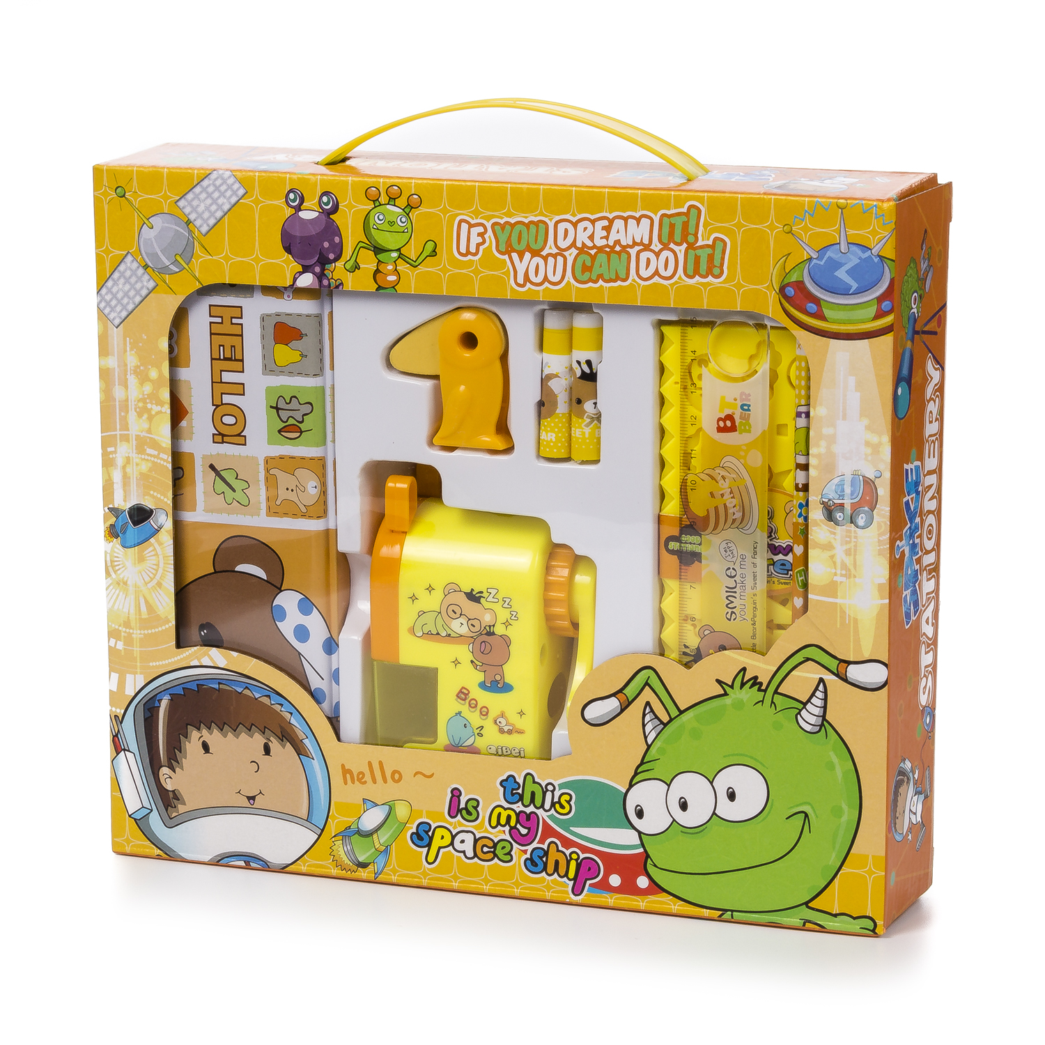 Ensemble de papeterie comprenant : • Coffret individuel en métal. 20,5x6,8x1,8cm. • Taille-crayon à manivelle • Gomme • Capuchons de crayon x2 • Règle avec loupe • Crayons x2 • Gabarits de dessin avec formes x4
