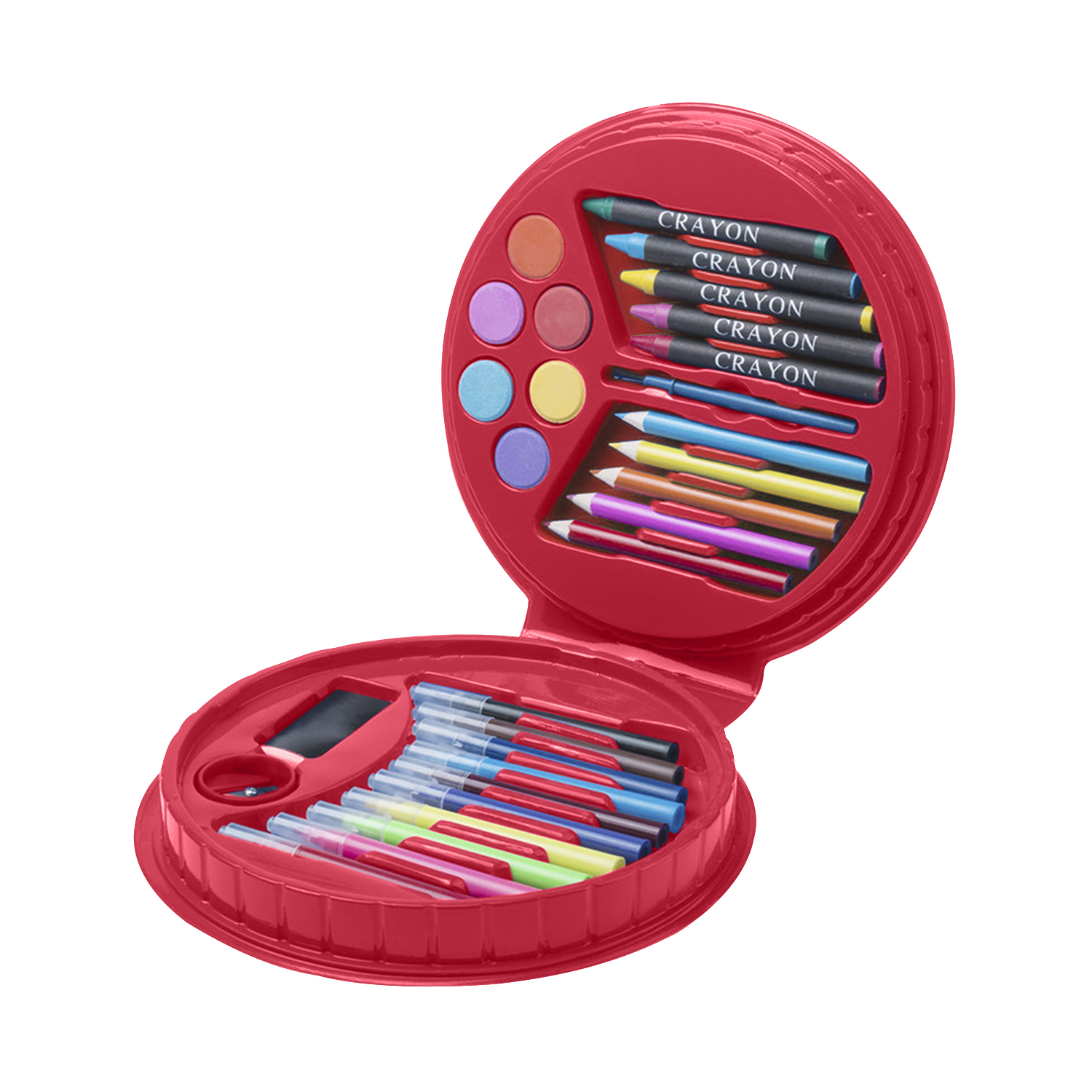 Ensemble de dessins Trinen : • Ensemble de 29 pièces dans un coffret de conception circulaire avec un corps résistant fini dans des couleurs vives et un intérieur avec compartiments de sécurité. • Contient une gomme, un taille-crayon, des crayons de couleur et des crayons cylindriques en bois, des marqueurs, des aquarelles et un pinceau.