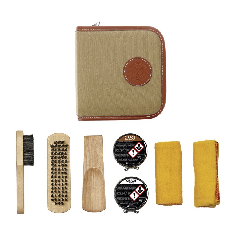 Compact et très pratique, cette trousse renferme tout le nécessaire pour nettoyer, cirer, lustrer et enfiler ses chaussures.