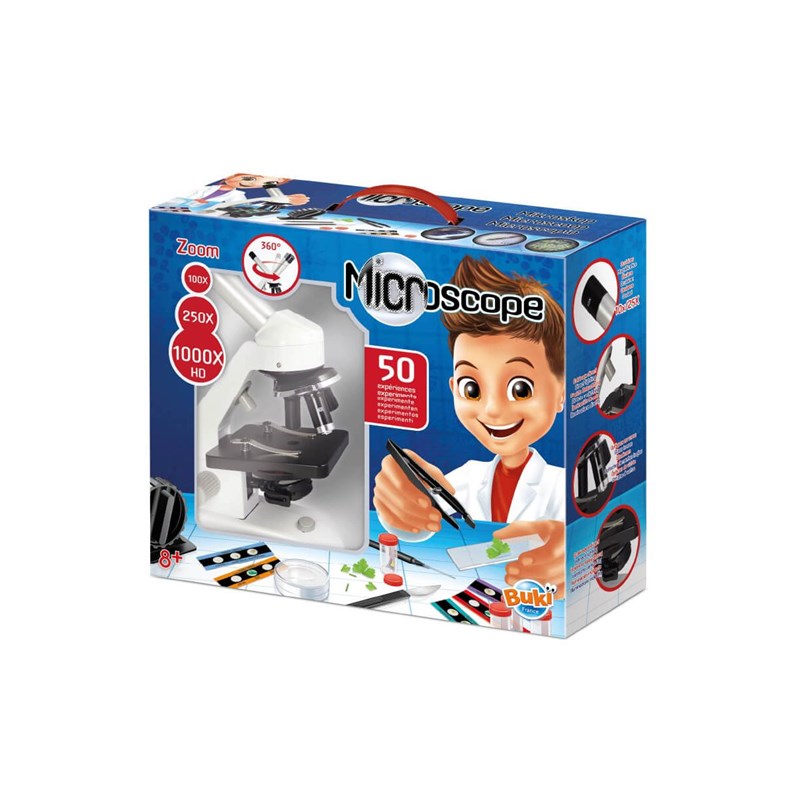 Au moyen d'accessoires adaptés et à l'aide des trois zooms, il découvre des cellules végétales d'un bulbe d'oignon, de sa salive, les secrets du papier journal et même les bactéries d'un yaourt ! Les optiques et oculaires en verre de ce microscope Buki lui assurent des observations de qualité.