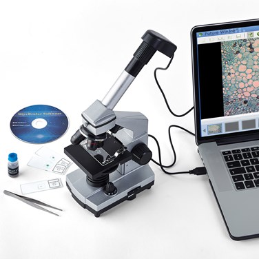 Contient : 1 microscope digital - 2 oculaires : 10x, 16x - 3 Objectifs : 4x, 10x, 40x - 1 Barlow : 2x - 1 oculaire numérique USB – 1 éclairage LED en haut et en bas – 1 platine de 90x90mm avec une règle mobile - 1 transformateur 5.5V - 1 boîtier en plastique - 1 CD Rom (fonctionne uniquement avec Windows)- 4 préparations - une pipette - une pince - des lamelles d’observation.