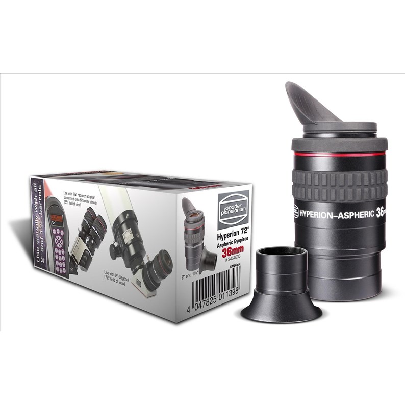 Oculaire asphérique Hyperion de 36 mm, grand angle de 72° pour le plus grand champ de vision réel possible . En raison de la géométrie asphérique de la lentille, il est à égalité avec les meilleurs oculaires à champ large de 2"" au monde, mais il est étonnamment compact et léger. Revêtement Phantom Group pour une absence totale de reflets, une brillance maximale et des performances de contraste exceptionnelles. Convient aux appareils photo reflex numériques comme oculaire de projection, avec filetage système SP 54