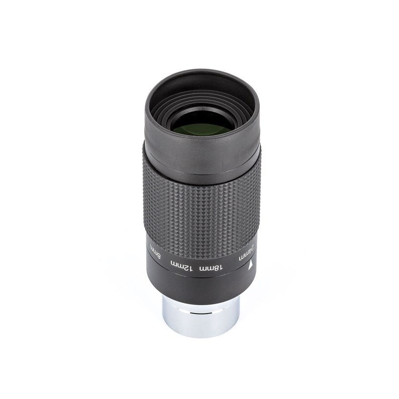 L'oculaire Zoom Sky-Watcher 8-24mm permet de couvrir toutes les focales allant 7mm à 21mm (et donc les grossissements correspondants) en un seul oculaire. Bien pratique quand on veut voyager léger et ne pas s'encombrer de toute sa gamme d'oculaires classiques. Il est particulièrement adapté aux petites lunettes transportables, comme la 80/400 qu'il convertit en véritable longue-vue terrestre. L'oculaire Zoom est au coulant 1.25"" (31,75mm), sa focale varie par rotation d'une partie de l'oculaire sur lui-même.