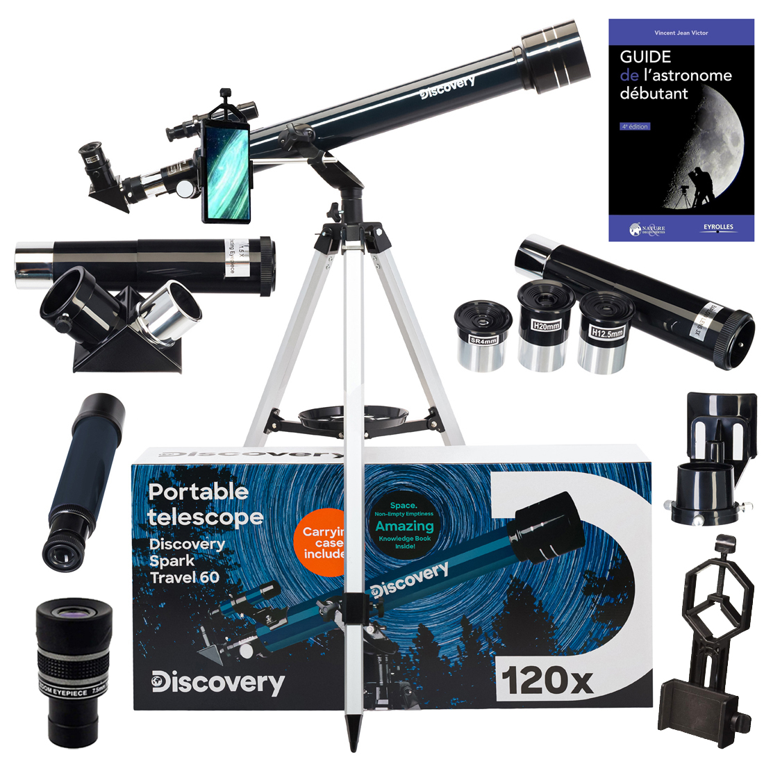 Le Levenhuk Discovery Spark Travel 60, déjà parfait pour les débutants, devient un véritable mini-observatoire portable avec l’ajout de deux accessoires puissants : l’oculaire Zoom SZ1 et un support smartphone pour astrophotographie.