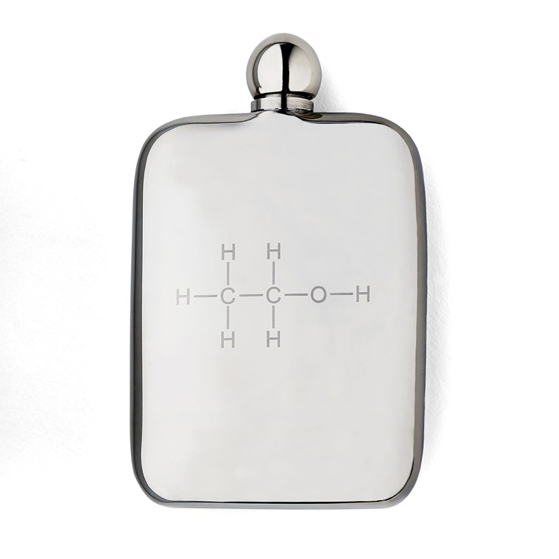 Cette flasque en acier inoxydable est de tous vos voyages. Discrète et élégante, elle offre un format compact idéal pour une pause gourmande en balade. Sur le devant, elle dévoile une gravure de la formule chimique de l'éthanol. Glissez-la dans une poche ou dans un sac à dos : elle vous suivra partout.