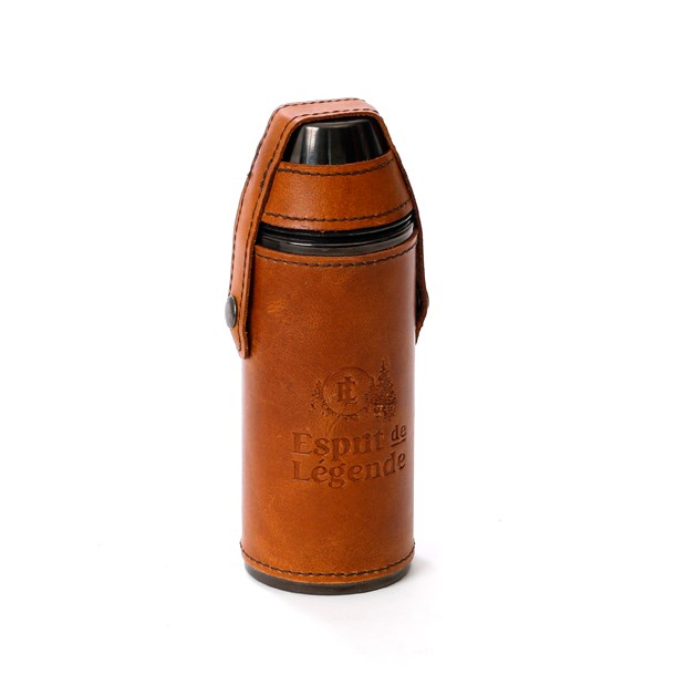 - Cette flasque en acier inoxydable est gainée d'un cuir au tannage végétal et aux finitions soignées.