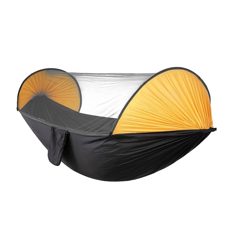 Hamac avec moustiquaire 140x290cm. • Ce hamac avec moustiquaire est simple et rapide à installer. Profitez du plein air sans perdre votre temps et sans être dérangé par les moustiques. • Il est doté de cordes coupe-vent des deux côtés, qui sont fixées au sol avec des clous de terre, de sorte que le hamac ne soit pas facile à secouer et empêche le hamac de glisser. • Idéal pour une utilisation en montagne, en camping, à la plage, lors de fêtes ou à l'intérieur de votre maison. • La surface conçue en nylon est lisse, ce qui rend le contact doux pour la peau et respirant, permettant aux enfants de jouer en toute sécurité. Idéal pour les cadeaux à la famille ou aux amis. • Accessoires inclus : 2x boucles de type D, 2x sangles d'arbre réglables et résistantes à l'usure de 2,8 m.