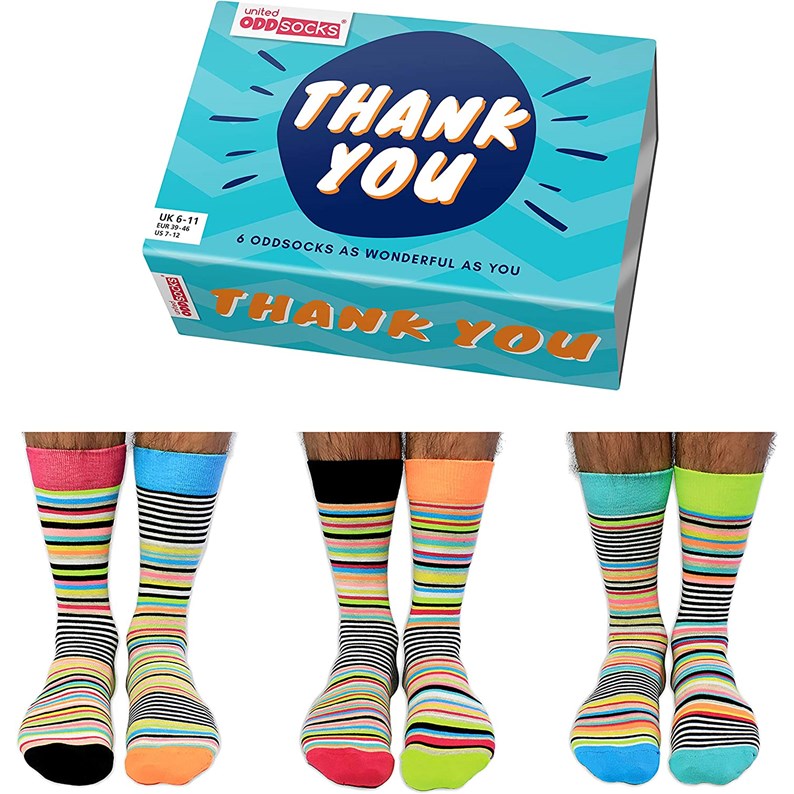 Quelle meilleure façon de dire merci à une personne très importante dans votre vie avec ce magnifique coffret de chaussettes fantaisies pour homme de United Oddsocks. Parfaitement décoré d'une manière qui se verra vraiment, et une paire de chaussettes envoyée avec amour, de la meilleure façon ."" Le destinataire de cette magnifique boîte de chaussettes pourra avoir les pieds les plus funky avec une variété de 6 chaussettes de conception différente, chacune avec des rayures et une fantastique gamme de couleurs pour vous faire sourire.