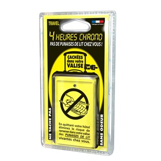 Pour éviter ce désagrément, la plaquette contient un produit biocide efficace en seulement quatre heures de temps. Il suffit de placer la plaquette dans la valise au moment de quitter sa chambre d'hôtel pour être certain que toutes les punaises seront détruites.