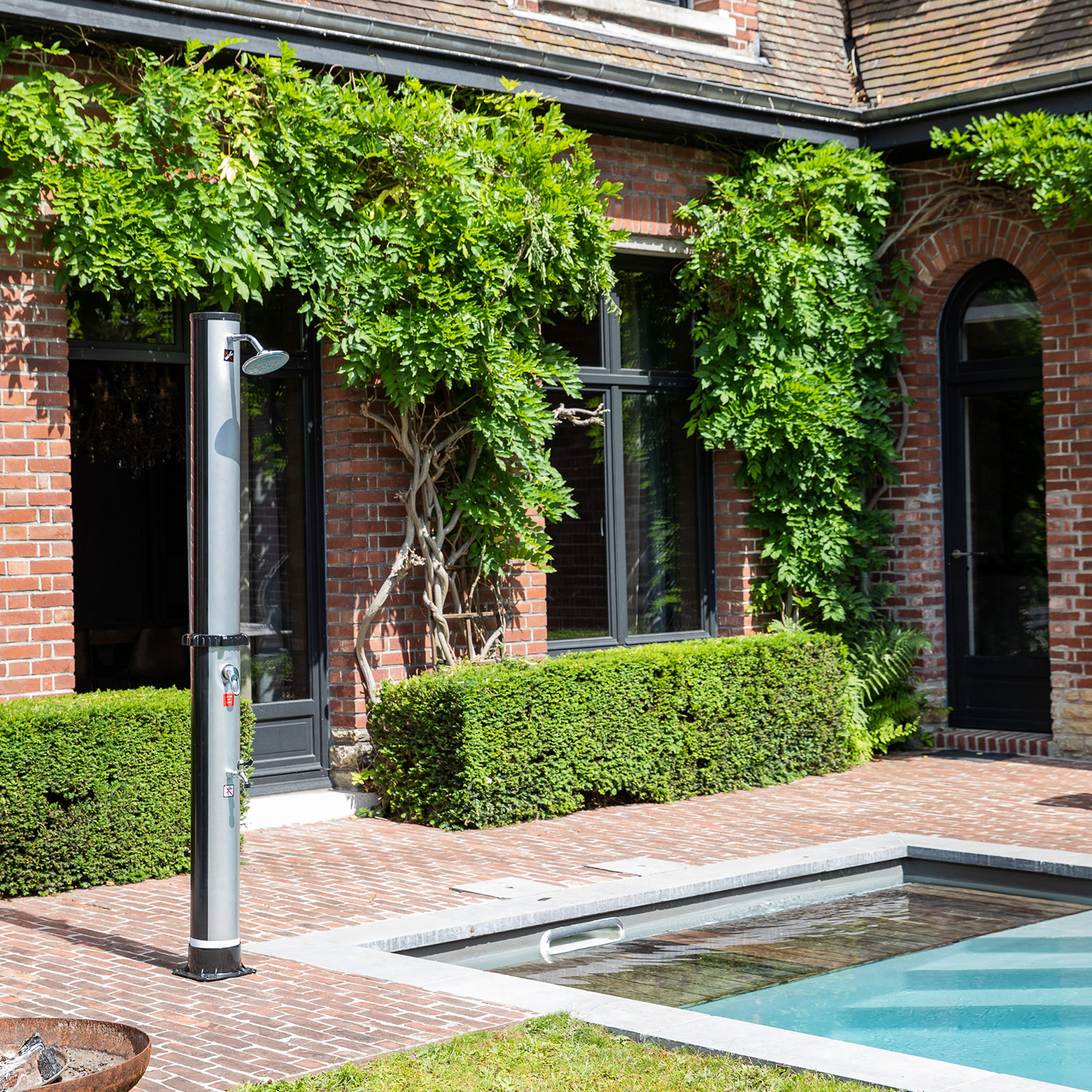 Prendre une douche chaude dans son jardin en préservant l'environnement et en faisant des économies est désormais possible grâce à la douche solaire FIDGI. L'eau est naturellement réchauffée grâce au réservoir en PVC qui capte l'énergie solaire. L'installation est simple et rapide : fixez la douche au sol et alimentez-la d'eau grâce à un tuyau d'arrosage. Et si vous souhaitez ne laver que vos pieds, la douche solaire FIDGI possède un rince-pieds en bas de sa colonne.