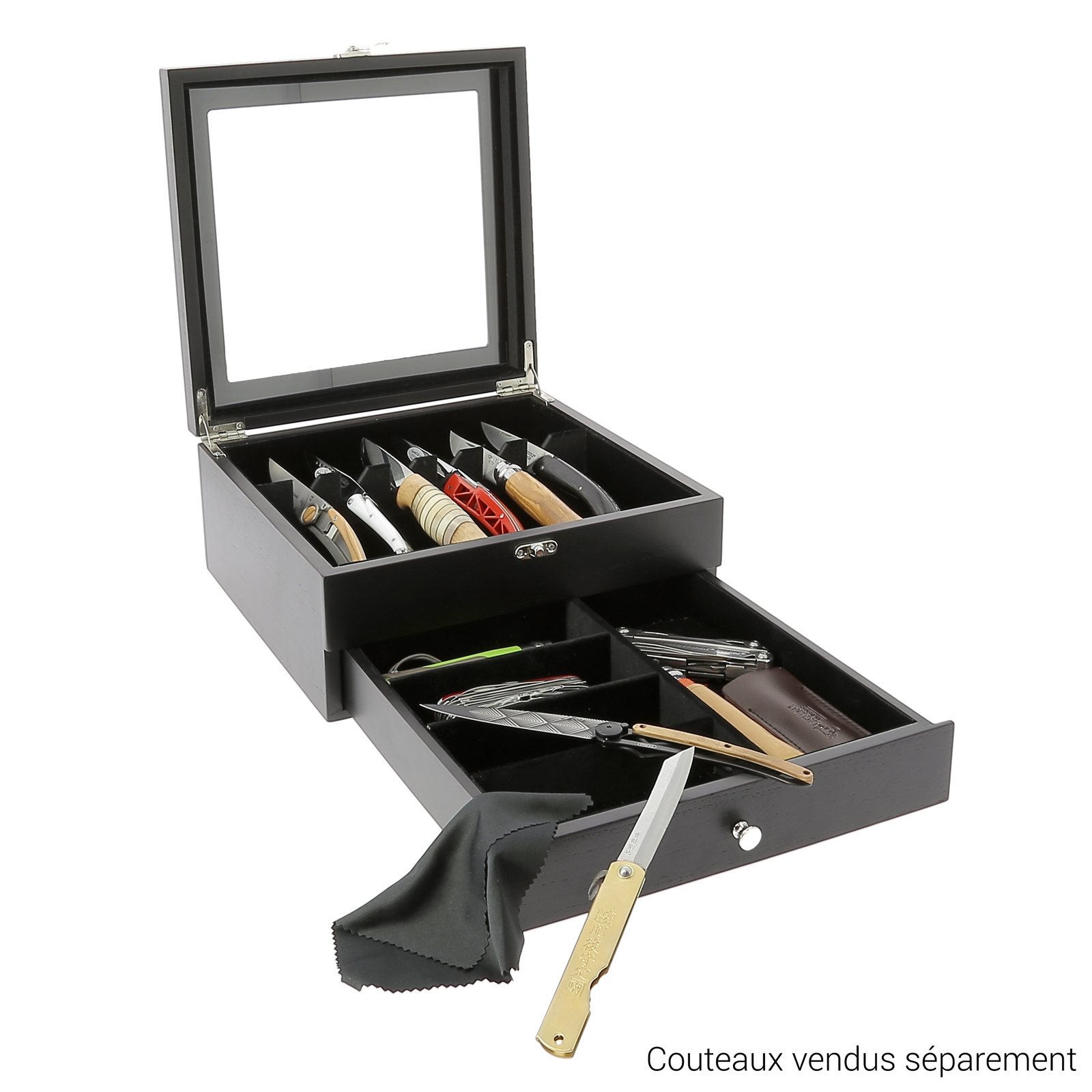 Un coffret inédit pour exposer vos plus beaux couteaux ! Il comprend 6 emplacements sous verre et, dans le tiroir en-dessous, 4 rangements et un compartiment pour vos étuis ou pierres à aiguiser.
