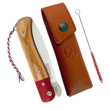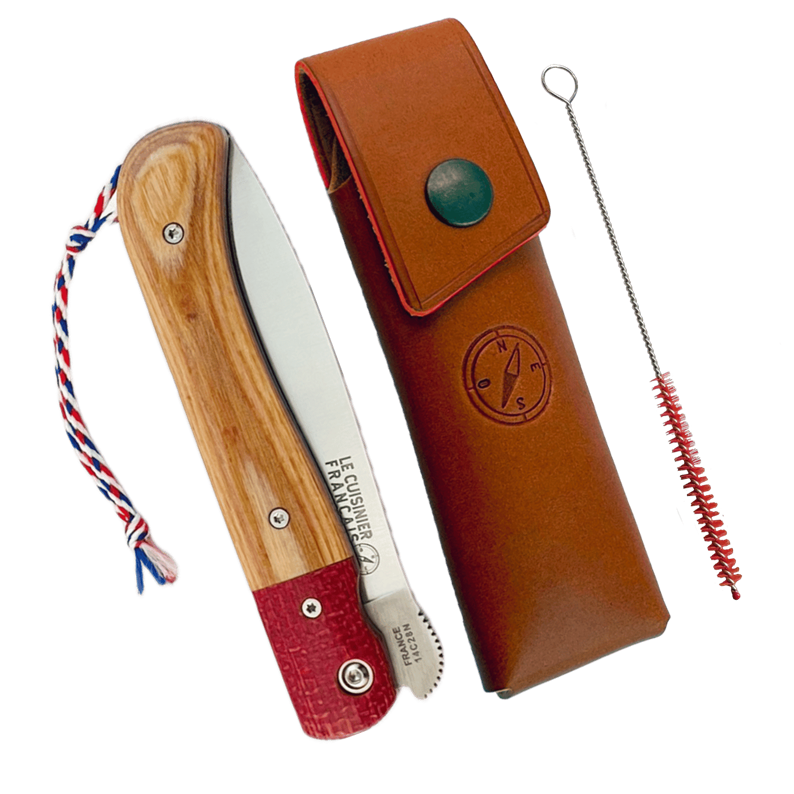 Ce pack réunit deux pièces d'exception pour les amateurs de cuisine nomade, de nature et de beaux objets : le couteau pliant Esperluète Mini, et son étui ceinture en cuir artisanal du Pays basque.