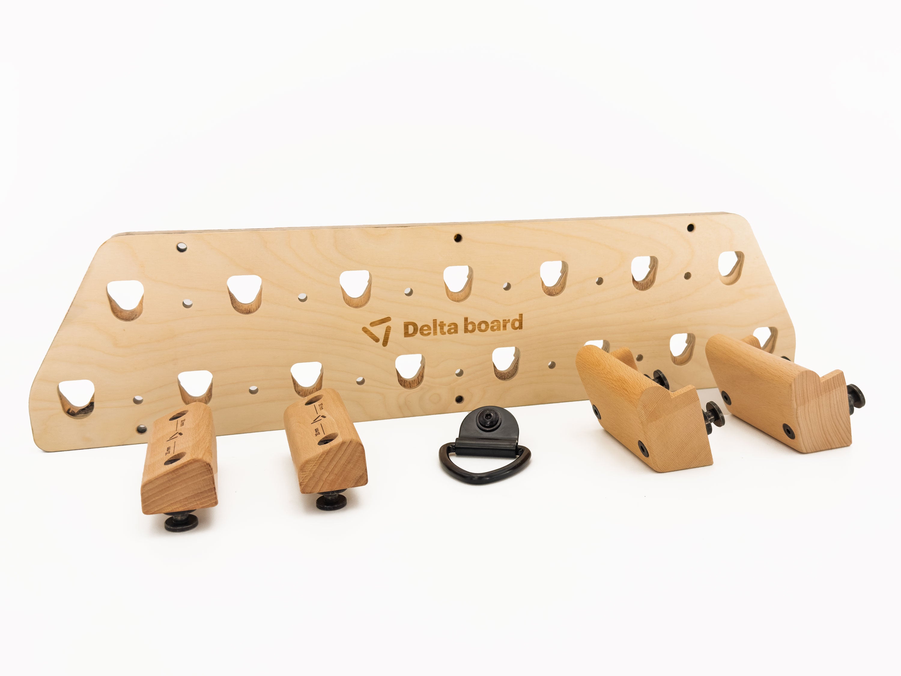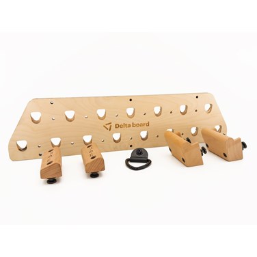Avec sa large gamme de prises modulaires et d'accessoires, la Deltaboard offre des possibilités infinies de personnalisation. Utilisez facilement une bande élastique avec notre crochet spécial pour vous délester, ou bien utilisez un système de poulie en quelques secondes pour vous entraîner aux suspensions à 1 bras !