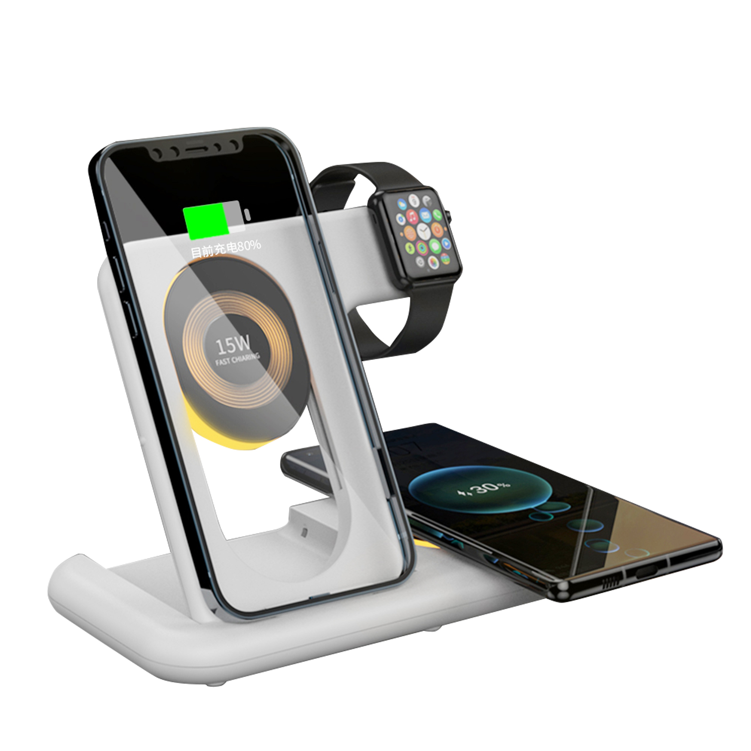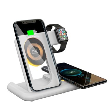 • Chargeur principal 15 W avec chargement sans fil Qi. La bobine peut être ajustée manuellement de haut en bas pour s'adapter à votre téléphone et à sa position, à la fois horizontalement et verticalement. • Touchez la veilleuse. • Vous pouvez charger la montre, le téléphone portable, le casque Bluetooth et la sortie du câble de données USB en même temps. • Prise en charge des téléphones mobiles : chargez tout en regardant vos séries et films préférés. • Support pliable pour gagner de la place. • Entrée d'alimentation : USB-C.