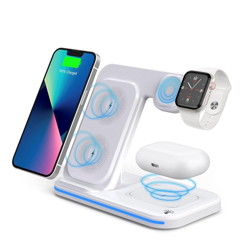 Base de chargement sans fil pliable 3 en 1. Base qi 15w double position.