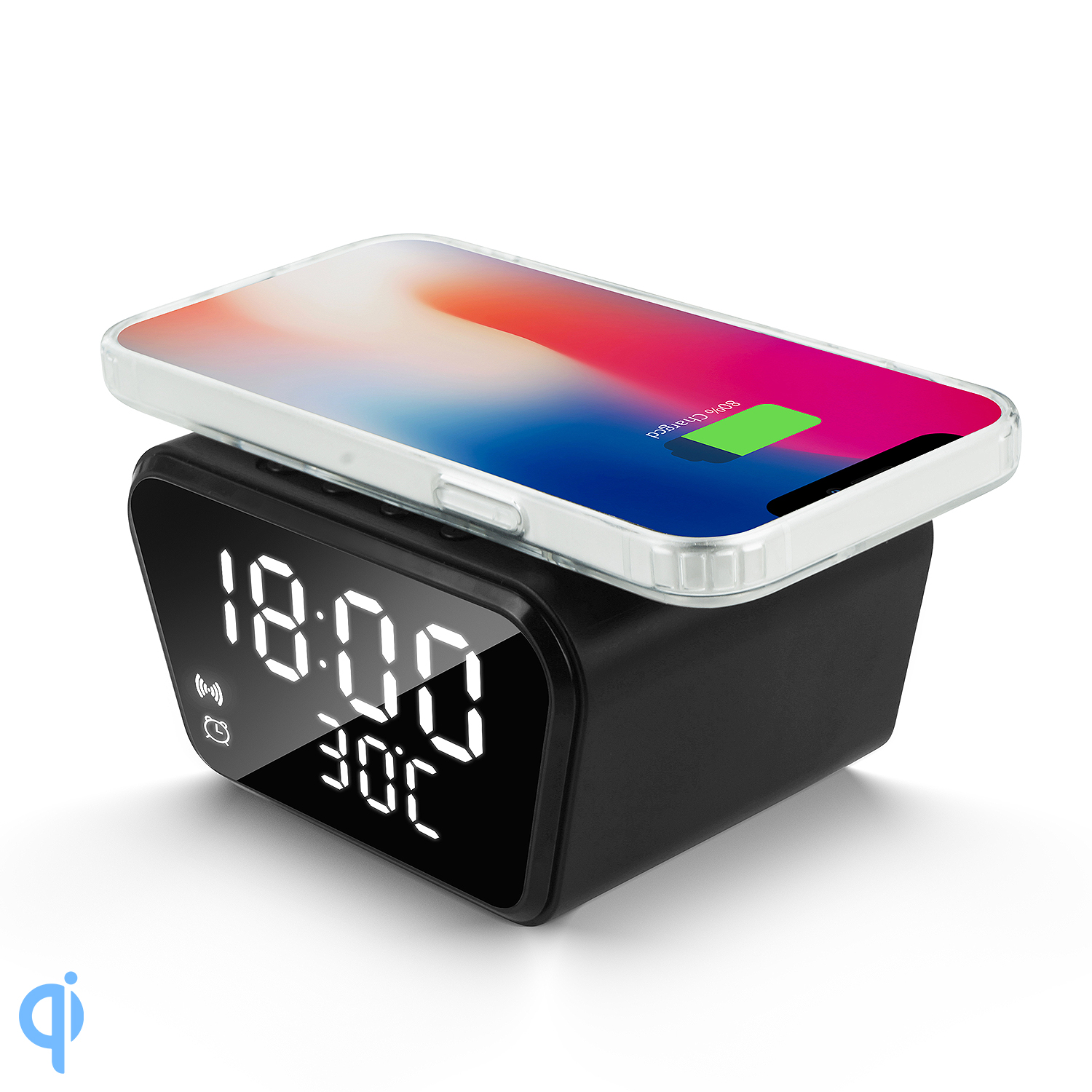 Réveil numérique avec chargeur qi intégré 15w. Avec date, heure, température.