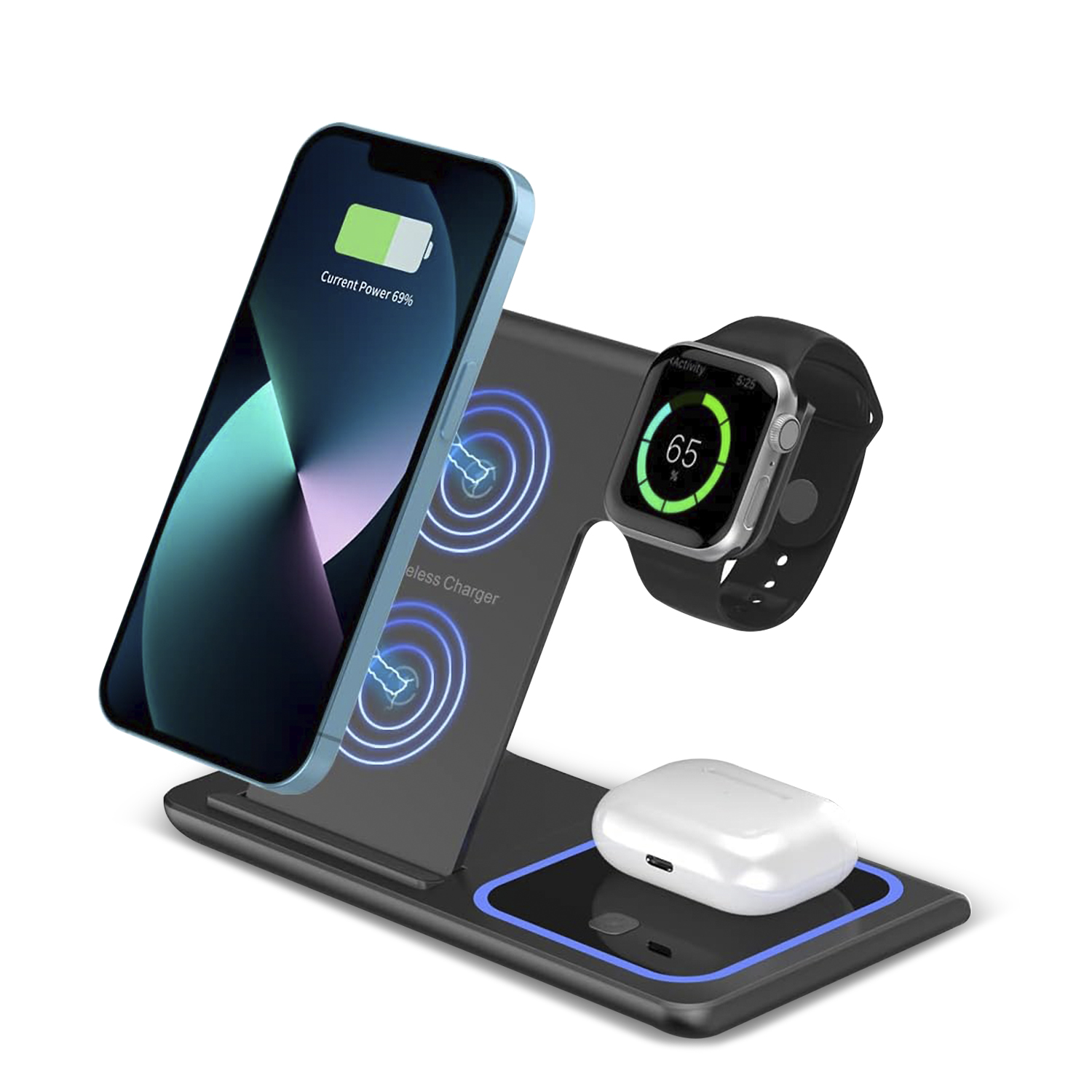 Base de chargement sans fil pliable 3 en 1 : • Chargeur principal 15 W compatible avec tout appareil doté de la norme Qi. Double position pour adapter votre smartphone en position horizontale ou verticale. Fonction support pour regarder vos vidéos et films préférés pendant le chargement. • Charge simultanément un smartphone et des écouteurs ou un autre smartphone (sortie 3 W) et une montre intelligente (sortie 2,5 W). • Il peut être facilement plié et transporté grâce à sa taille compacte. • Lumière ambiante, désactivable. • Entrée d'alimentation : USB-C. Un adaptateur secteur USB d'au moins 18 W ou plus est recommandé (non inclus).