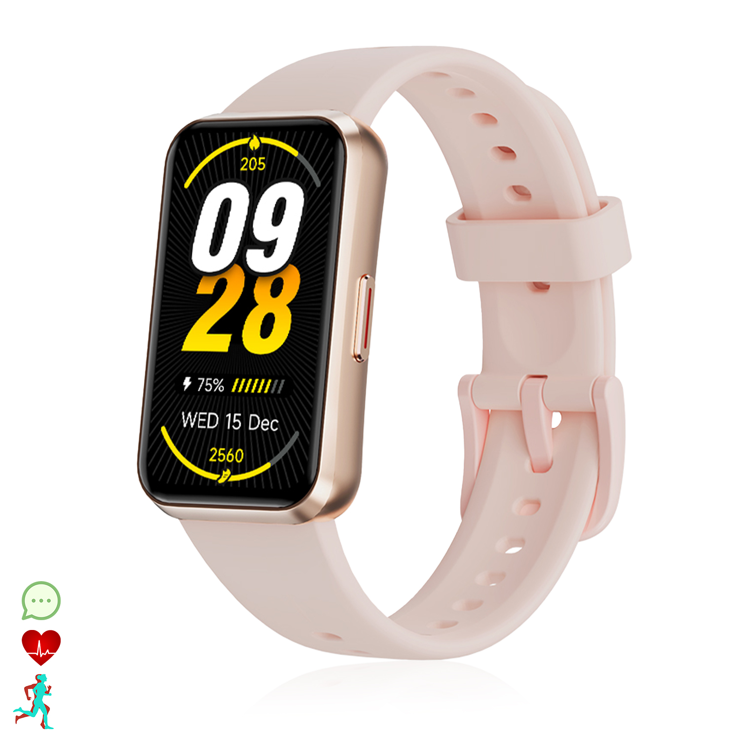 • Écran TFT de 1,47 pouces entièrement tactile avec réglage de la luminosité et activation automatique en tournant le poignet. Résolution de 172*320 px.