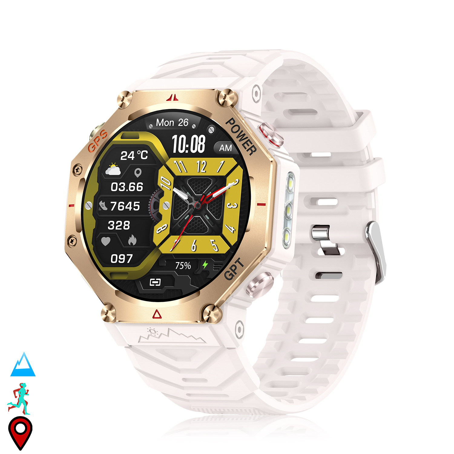 • Informations météorologiques (application nécessaire) et outils d'exploration parmi lesquels vous trouverez une lampe de poche tactile avec 3 modes d'utilisation, un baromètre avec niveau d'altitude/pression de l'air, une boussole et le plus important “SOS”.
