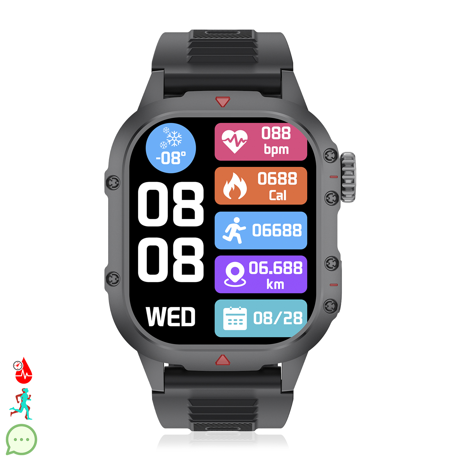 • Écran tactile LCD de 1,75 pouces avec mise en marche automatique en retournant le poignet. Couronne rotative multifonction.