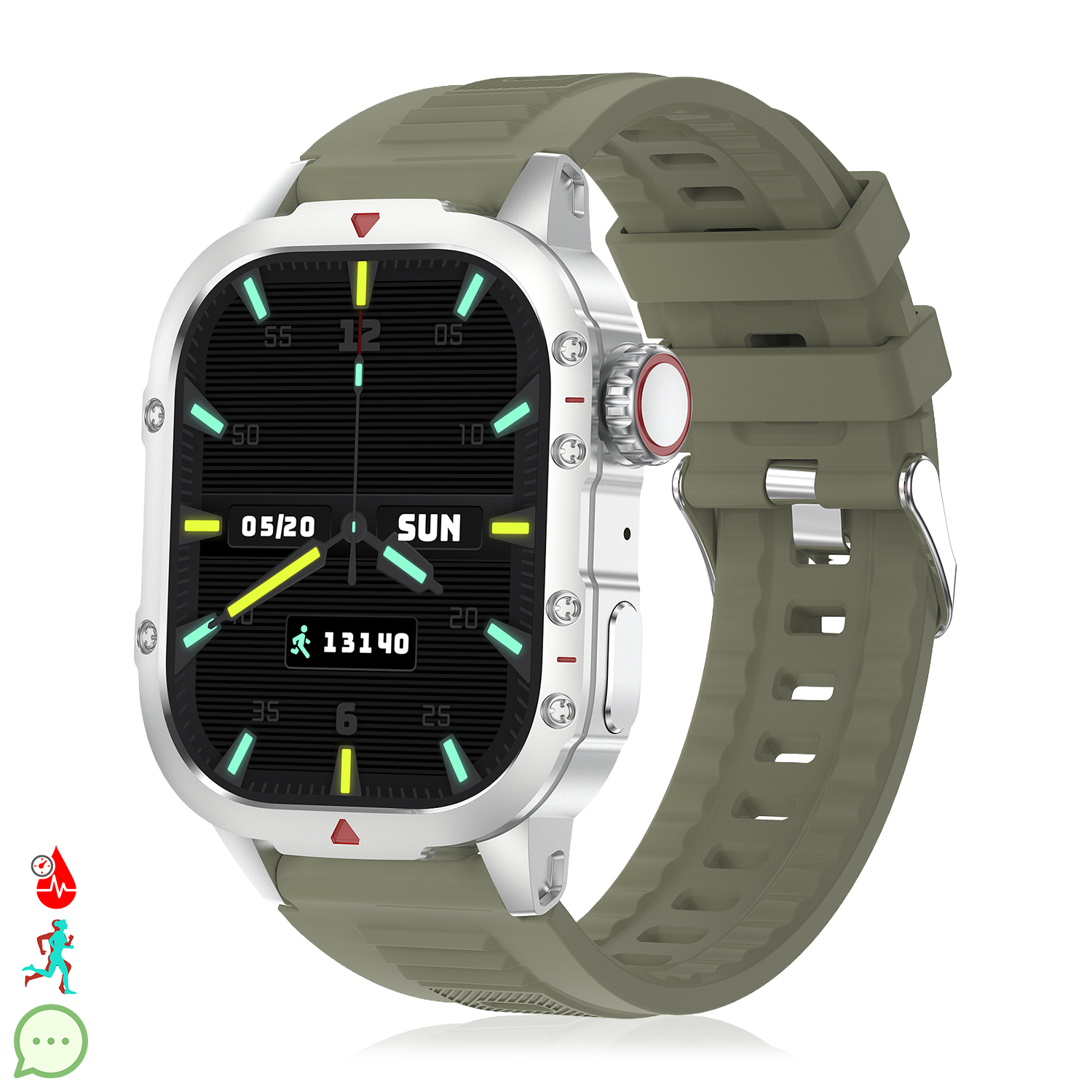 • Écran tactile LCD de 1,75 pouces avec allumage automatique en tournant le poignet. Couronne rotative multifonction.