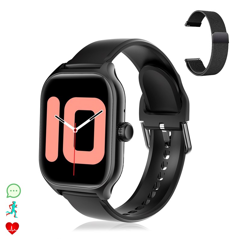 • Chronomètre, recherche de la montre (depuis l'application), recherche du smartphone, alarme, calendrier, calculatrice, SOS, jeu de compétences, déclencheur à distance de la caméra du smartphone, contrôle à distance de la lecture musicale sur votre téléphone et possibilité de lire l'audio de la musique depuis la montre. Accès à l'assistant vocal Siri et Ok Google (vérifiez la disponibilité sur votre smartphone).