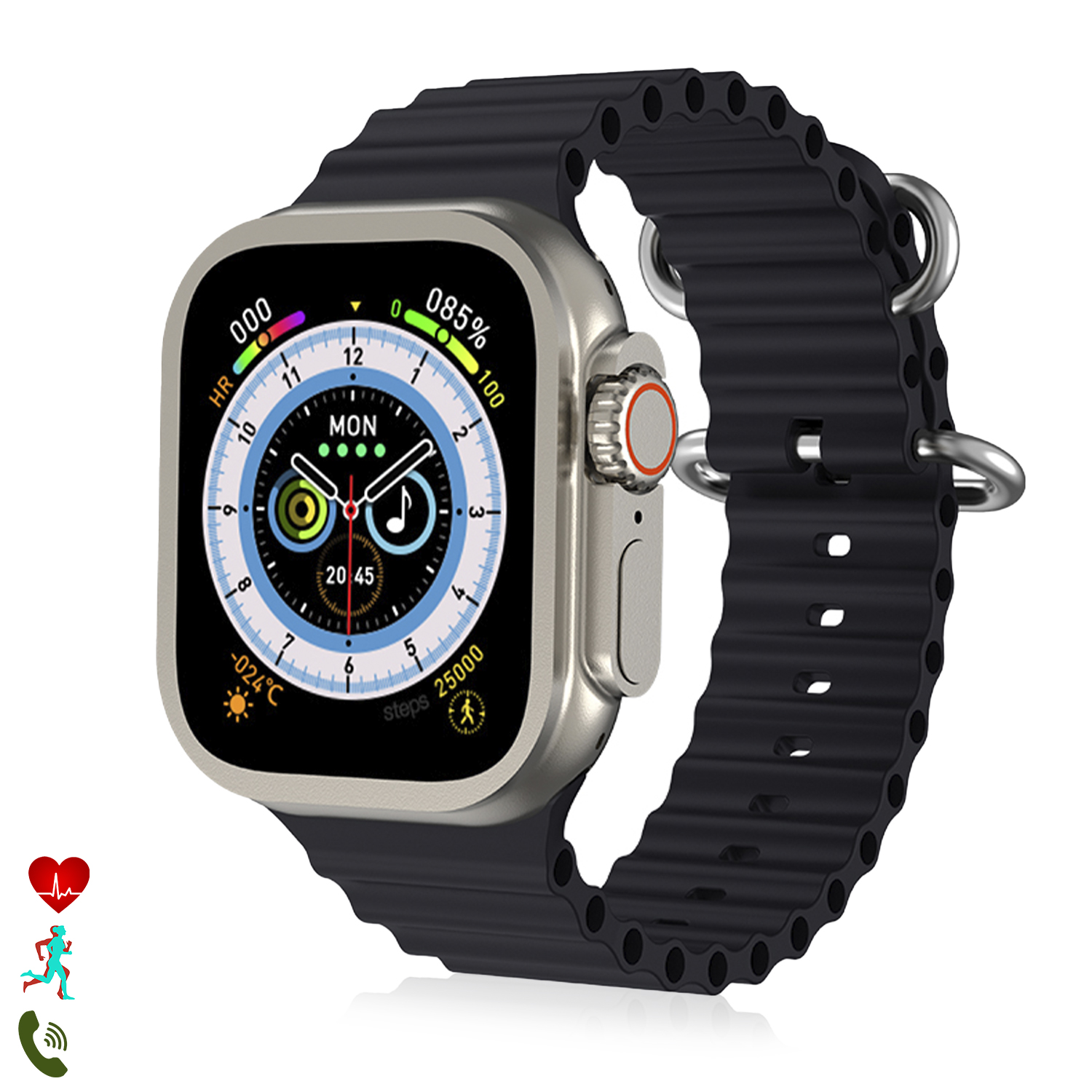 • Écran TFT de 1,91 pouces entièrement tactile, 240*296 pixels avec réglage de la luminosité et allumage automatique en tournant le poignet, il dispose également d'une couronne multifonction.