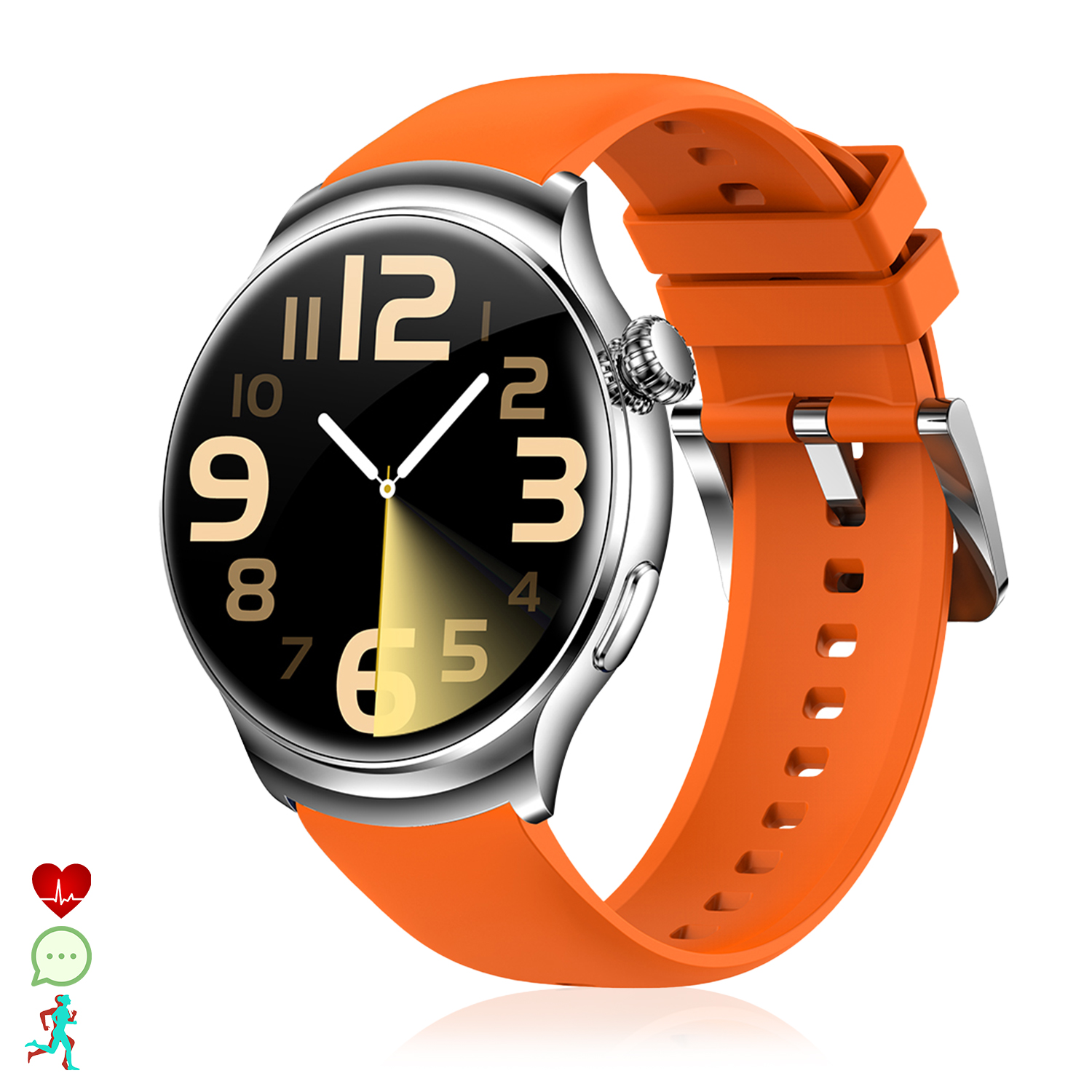 • Écran AMOLED de 1,52 pouces entièrement tactile avec 480 * 480 pixels, réglage de la luminosité, allumage automatique en retournant le poignet et couronne multifonction avec accès rapide configurable.