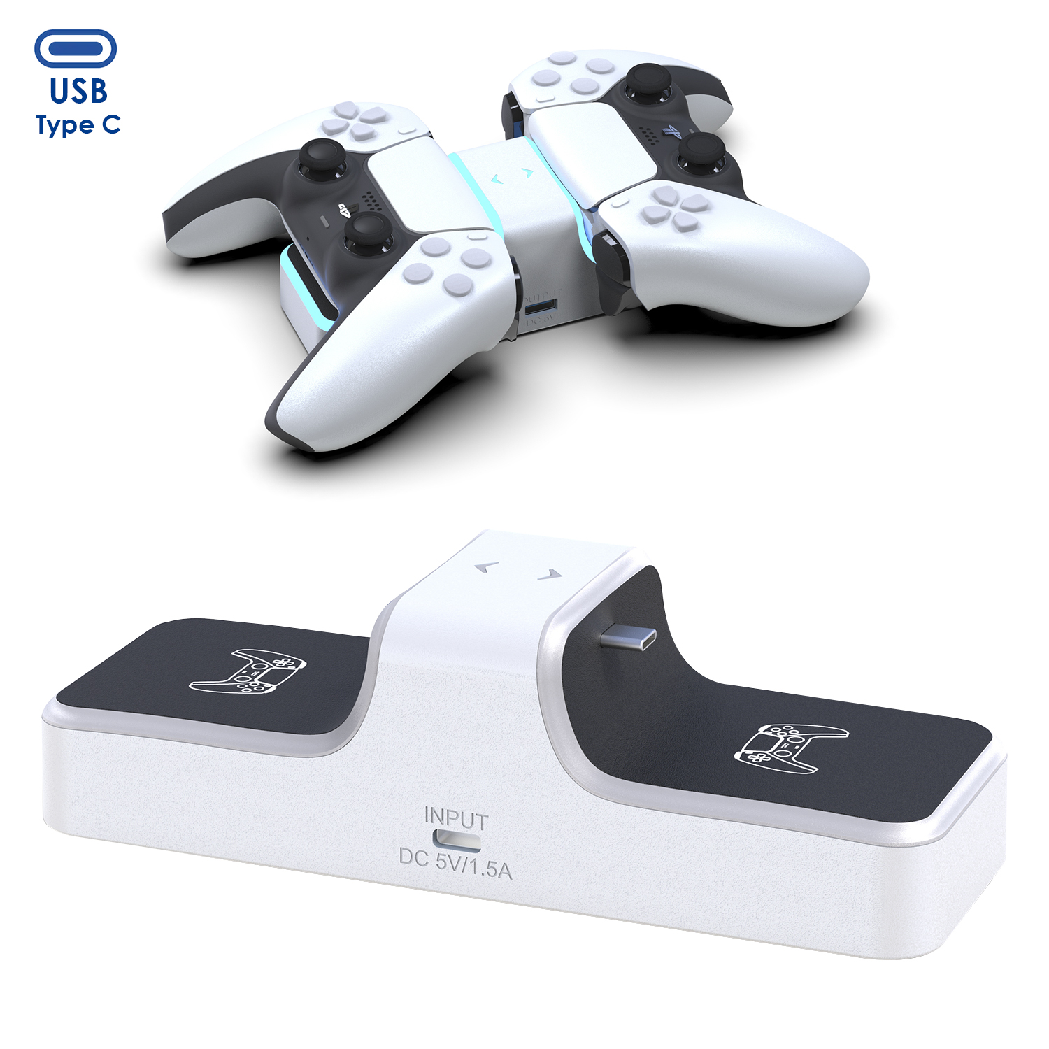 Chargeur double pour 2 manettes de ps5. Comprend une sortie de charge usb.