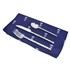 - 2 jeux complets de couverts design en acier inoxydable (diamètre 18cm) comprenant 2 couteaux, 2 fourchettes et 2 cuillères à café maintenus par des sangles en cuir surpiqué.