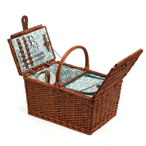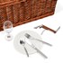 - Ce panier contient tout le nécessaire pour 4 personnes : fourchettes, couteaux, cuillères en acier inoxydable, verres en verre et assiettes en céramique.