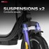 Ses pneus 8,5 pouces avec chambre à air et ses doubles suspensions assurent un bon confort de conduite. Le frein à disque arrière garantit un freinage efficace. L'écran LED affiche vitesse et batterie en direct. Résistance IPX5, poids 15 kg, charge max 100 kg