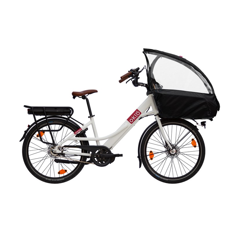 Un grand baquet est fixé à l’avant du cadre et ne tourne pas avec le guidon : la direction reste légère même avec 20 kg de chargement. Il est équipé avec le confortable kit d’accueil bébé et la capote de pluie qui protège l'enfant du froid et des intempéries. En cas de chute, l’arceau au-dessus de la tête de l’enfant, combiné au port du casque, garantissent une excellente protection.